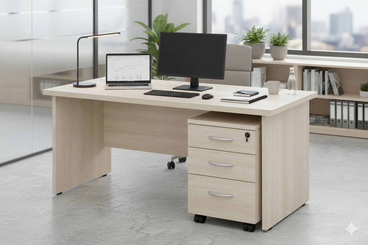 Introducing the elegant Executive Table with Moving Drawer Model: CKT-07, designed to transform your office space with its sleek and modern appearance. Built from an 18 mm thick, waterproof laminated melamine board that ensures reliable durability, this table is engineered to thrive in demanding environments. The premium Albino Oak finish adds a touch of sophistication and seamlessly elevates your workspace decor.
